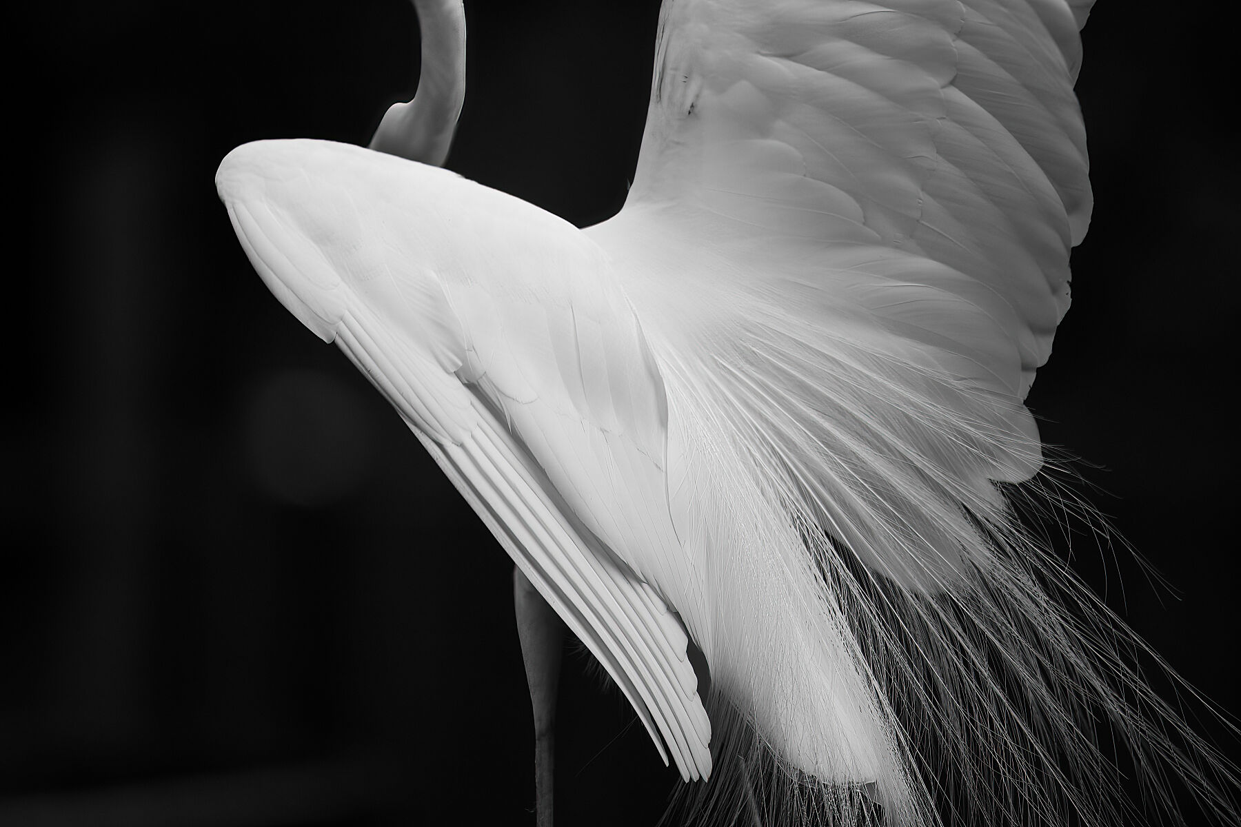 The image embraces a minimalist photography approach, reducing the scene to essential lines and tonal transitions. Light gently grazes the surface of the plumage, revealing intricate details while maintaining a sense of softness and continuity. The interplay between brightness and shadow creates a sculptural quality, transforming the natural subject into an almost abstract expression of balance, weightlessness, and quiet strength.