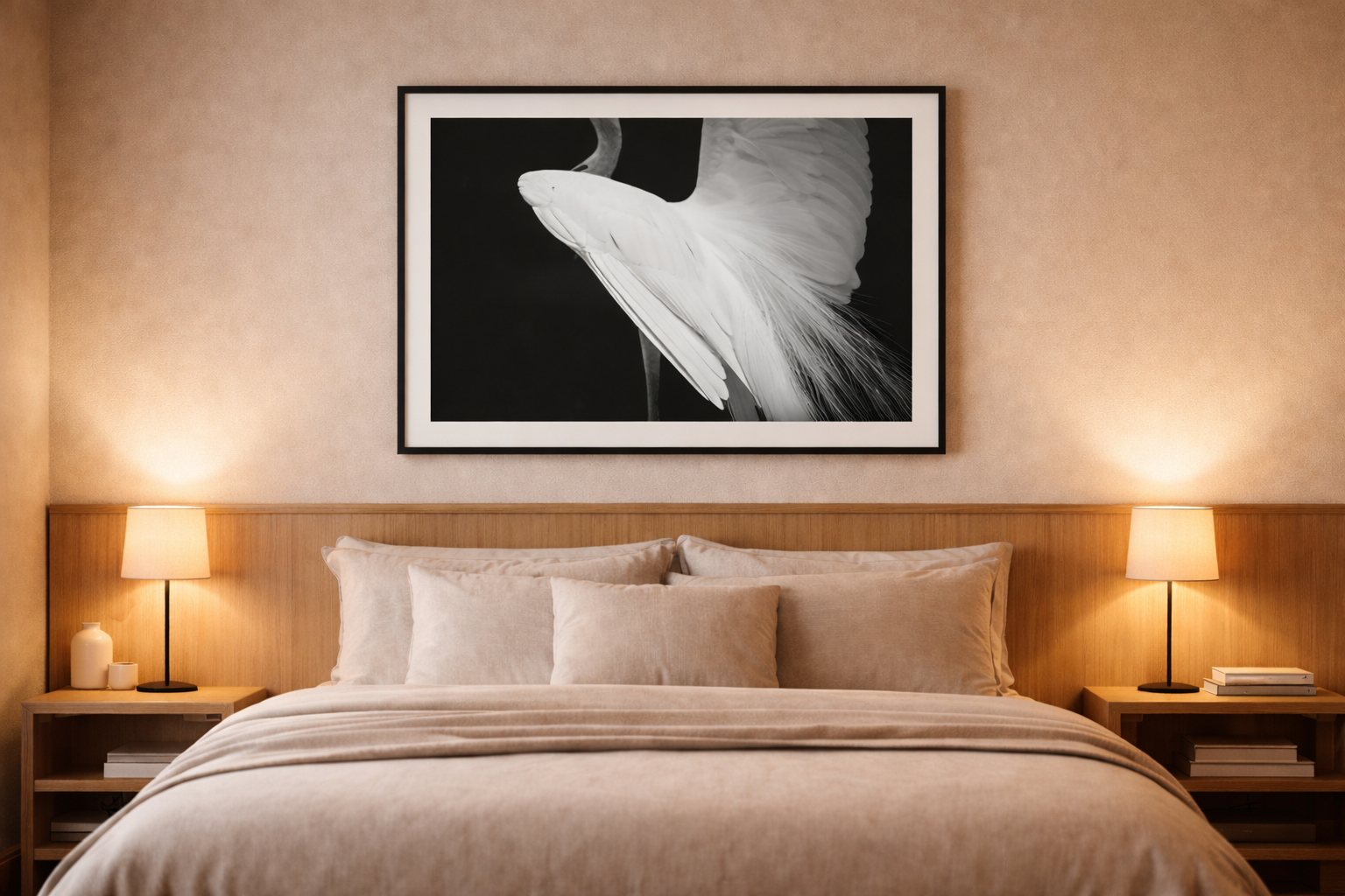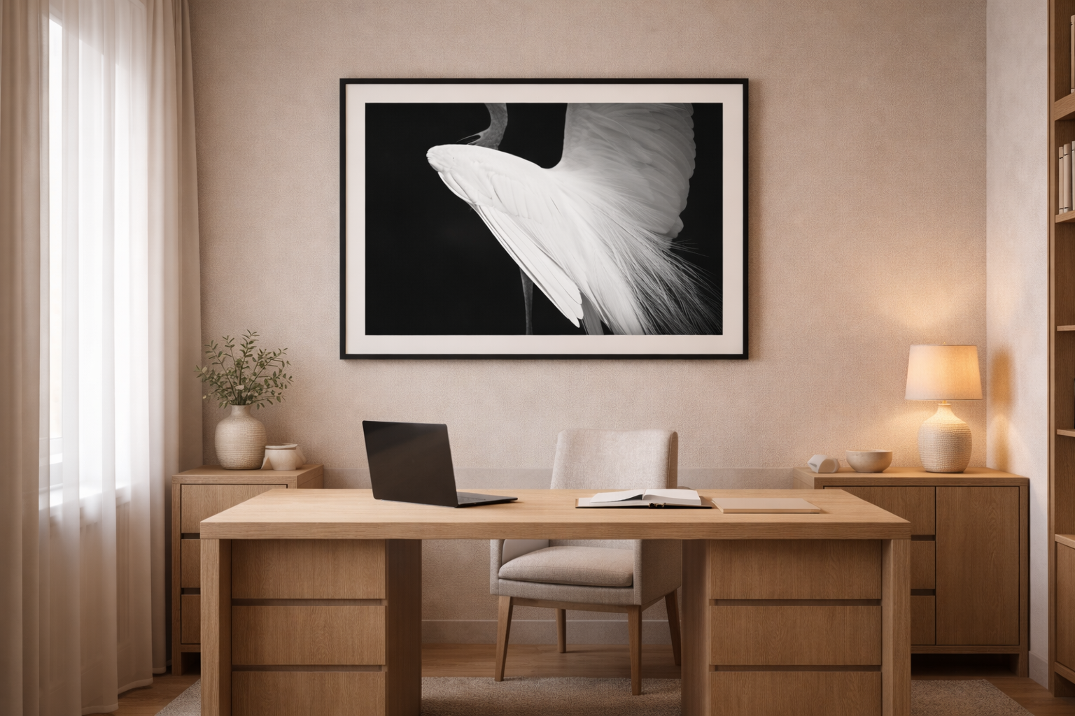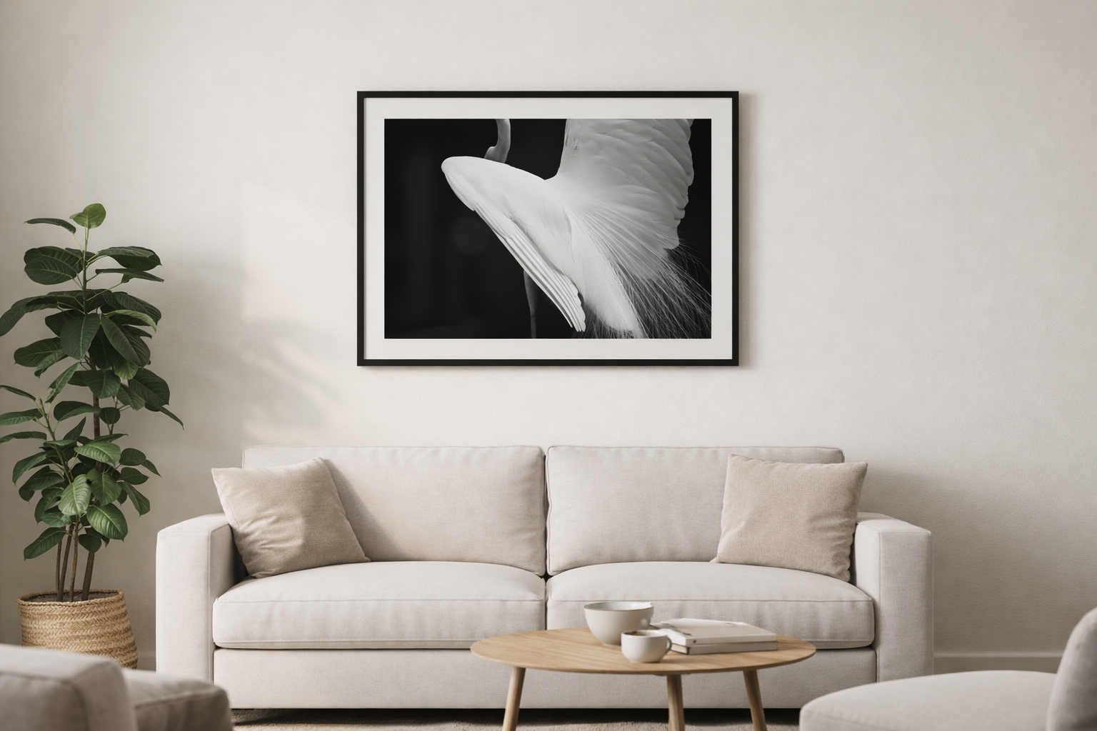 A quiet fragment of movement unfolds in this refined black and white photography print, where the delicate curvature of a bird’s wing becomes the central subject. The composition isolates form and gesture, allowing the viewer to focus on the graceful extension of feathers as they dissolve into soft, luminous textures. The surrounding darkness enhances the sense of suspension, as if time itself has paused in a moment of silent elevation.