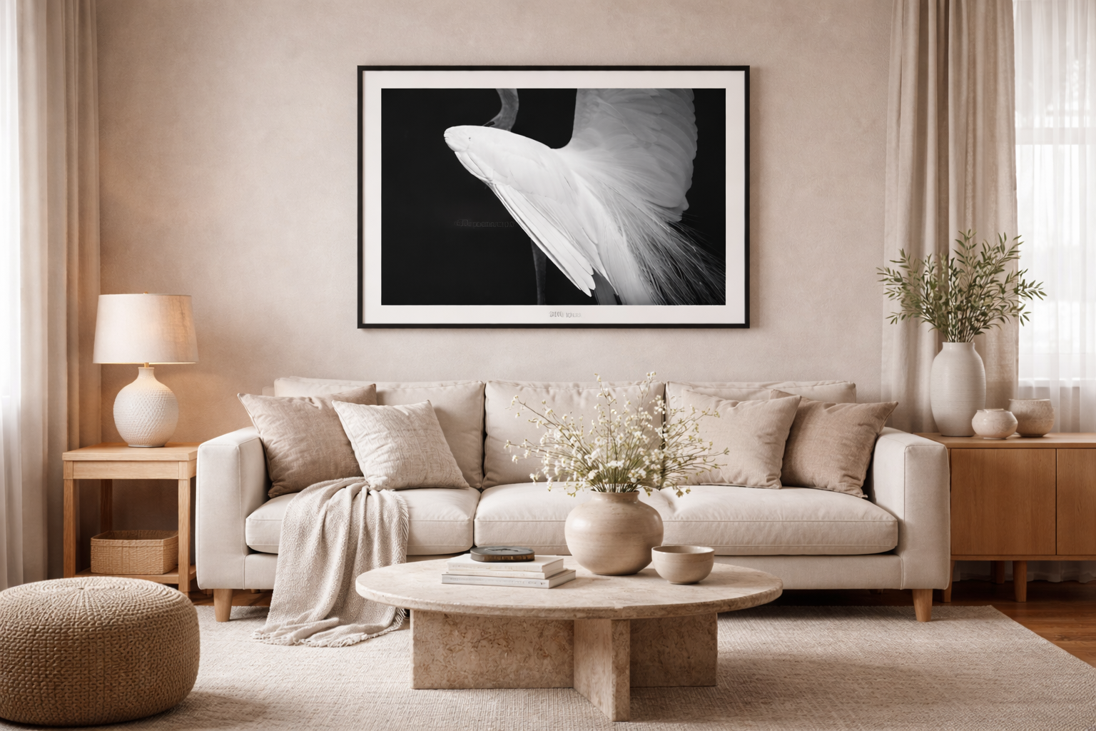 This black and white fine art print is perfectly suited for modern living rooms, minimalist interiors, and serene bedrooms where calm and balance are essential. Its soft contrasts and elegant composition bring a sense of lightness and refinement, enhancing spaces designed for relaxation and contemplation.