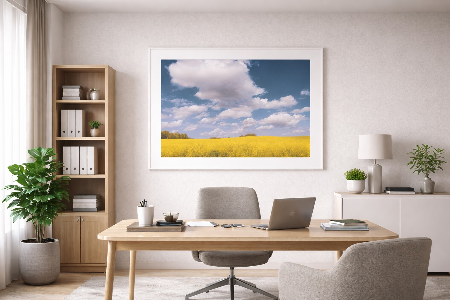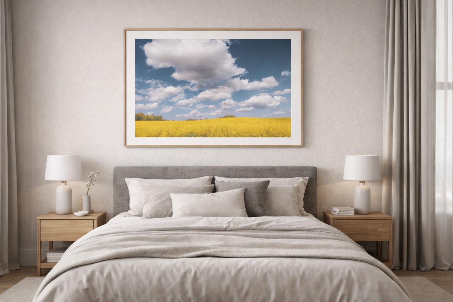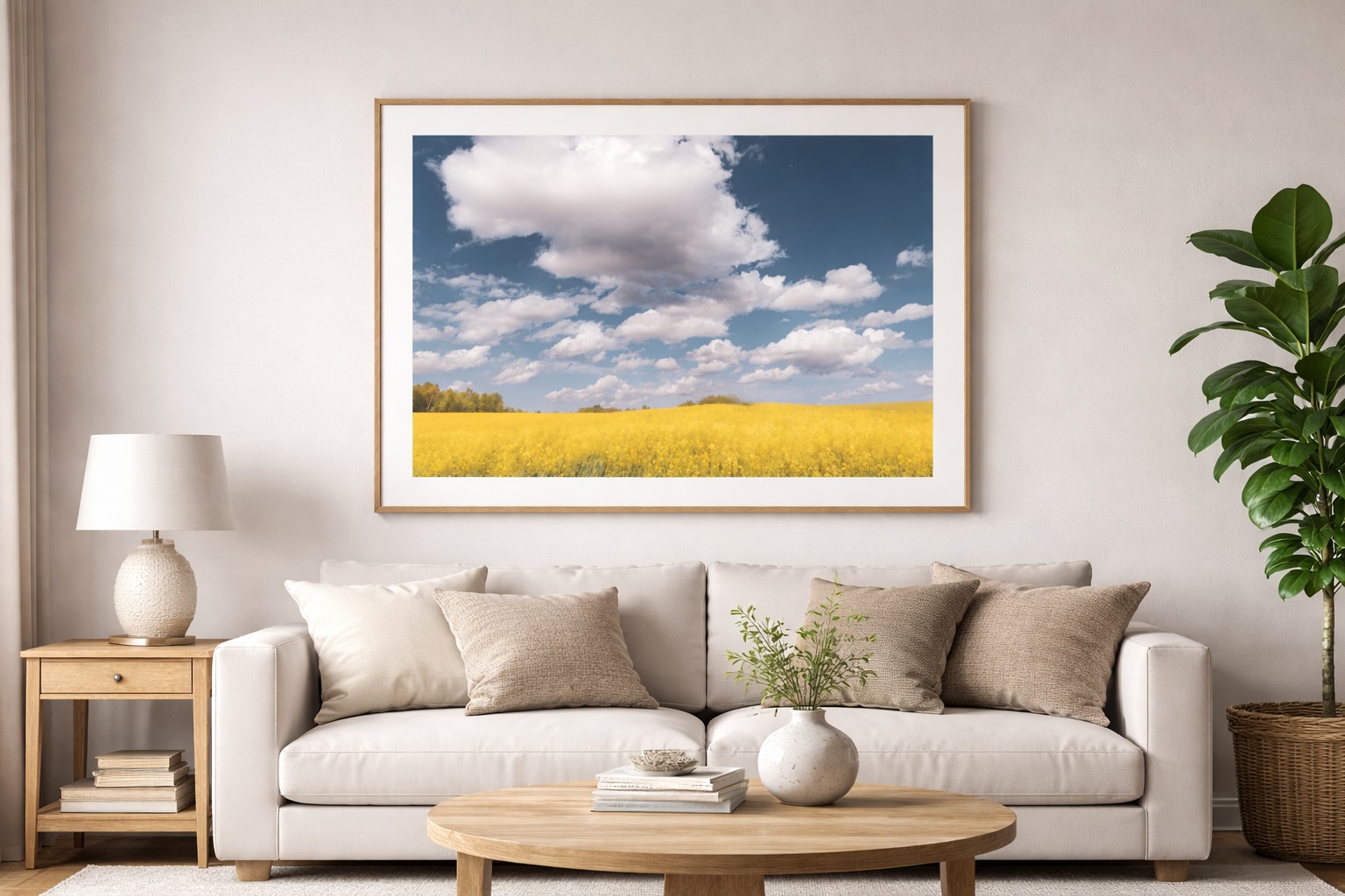Passing Clouds captures the suspended calm of an open landscape, where a vast sky drifts above a luminous field in bloom. The scene is shaped by a refined balance between earth and air: the golden expanse stretches quietly along the horizon while soft, voluminous clouds gather overhead, creating a sense of movement within stillness. This fine art photography print invites the eye into a wide, meditative space where scale becomes emotional as much as visual.