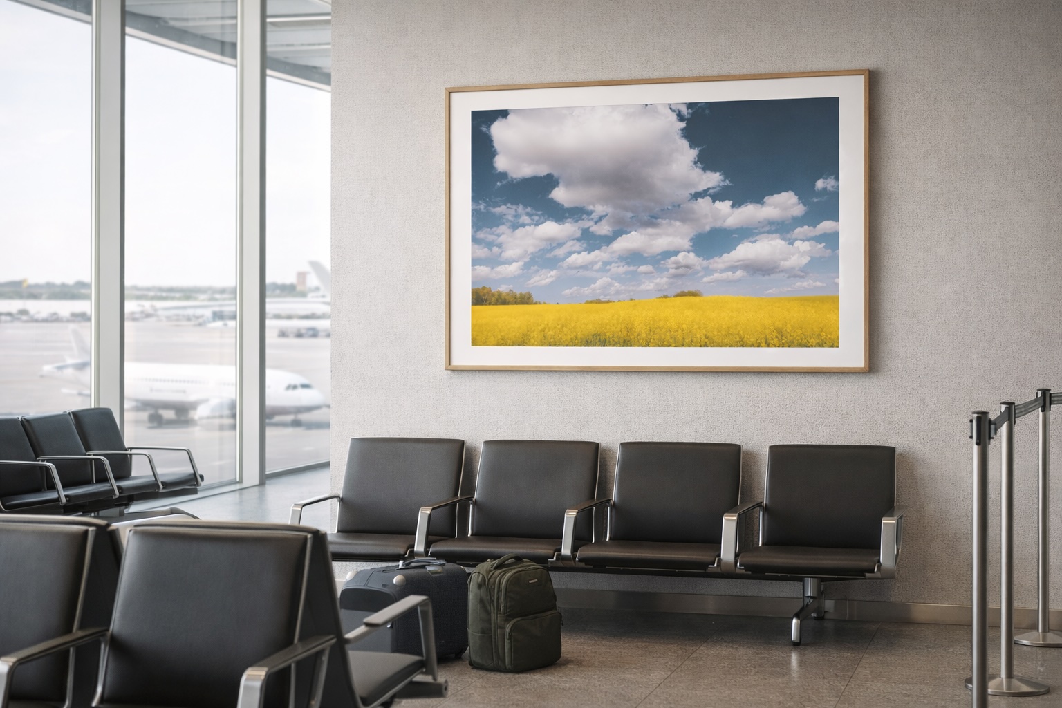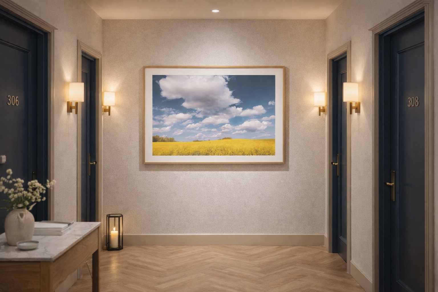 This artwork is especially suited to modern living rooms, minimalist interiors, bedrooms, architecture studios, boutique hotels, and design offices where light, openness, and calm are central to the atmosphere. Its luminous palette and expansive sky help create visual breathing space, making the print a refined focal point without overwhelming the room.