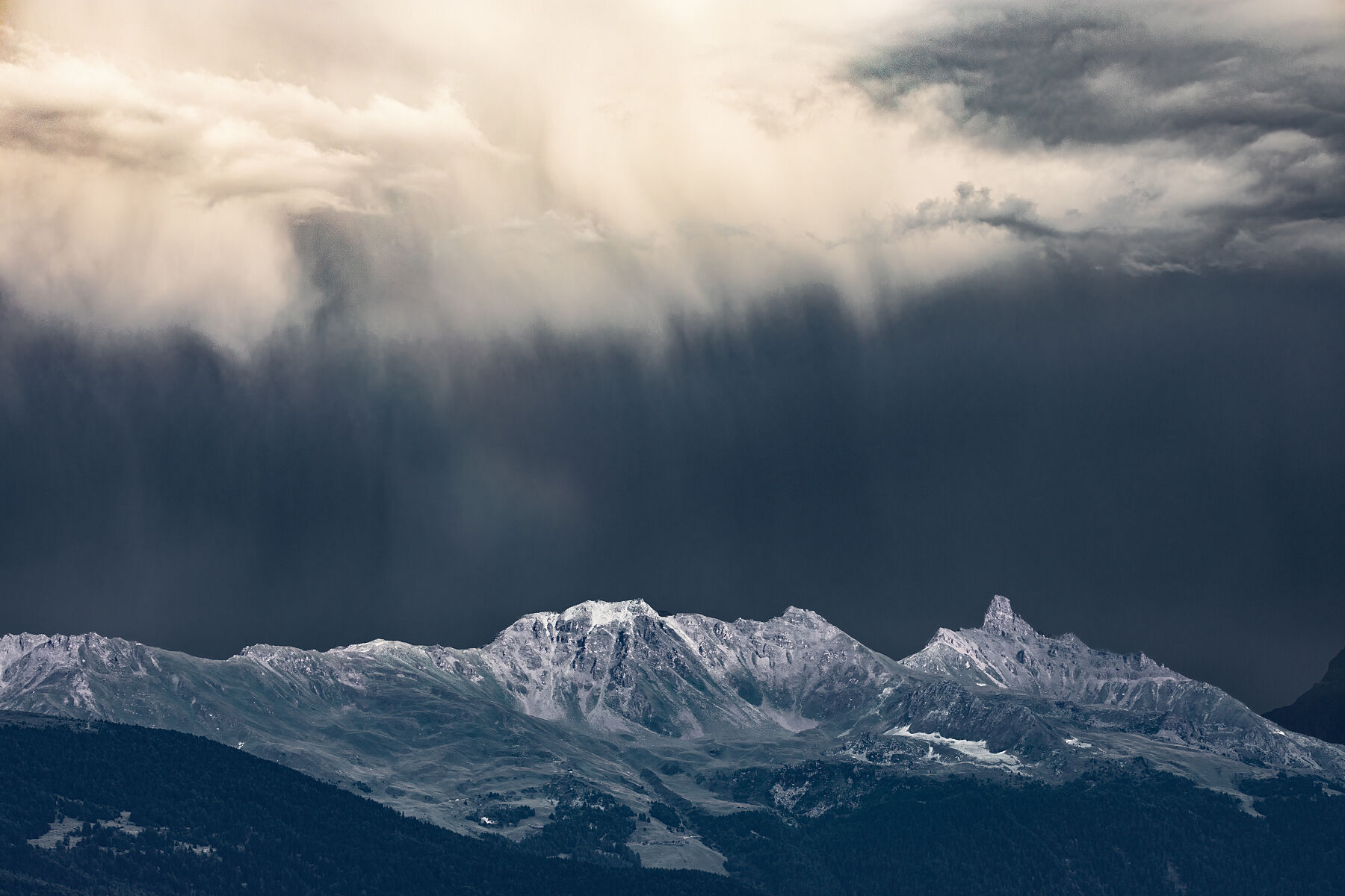 A mountain range rests beneath a descending sky, where light and darkness meet in a suspended moment. Clouds fall like a veil, soft yet powerful, transforming the landscape into a space of transition. The composition is essential, balanced, and quiet, an image that speaks of waiting, passage, and presence without narration.